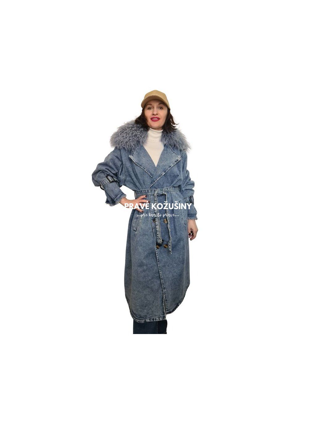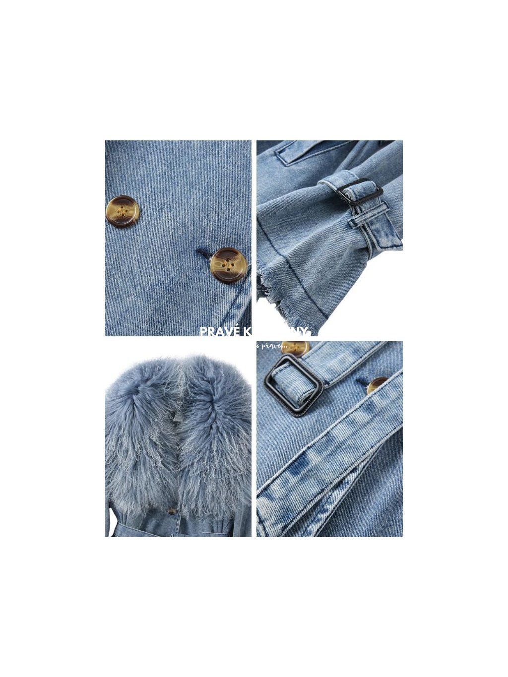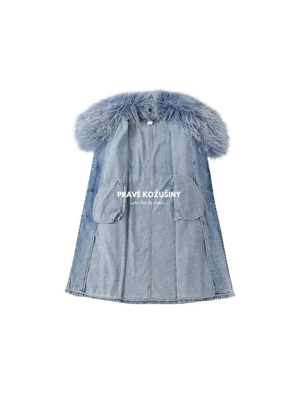 Denimový dámsky kabát s nádherným golierom z pravej mongolskej ovce.