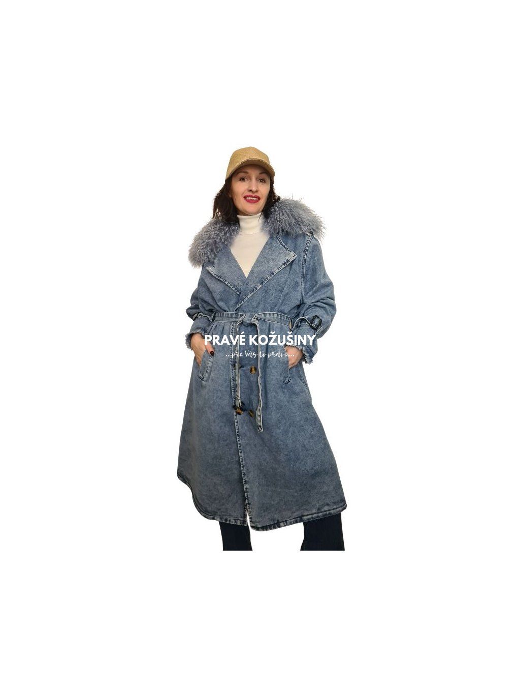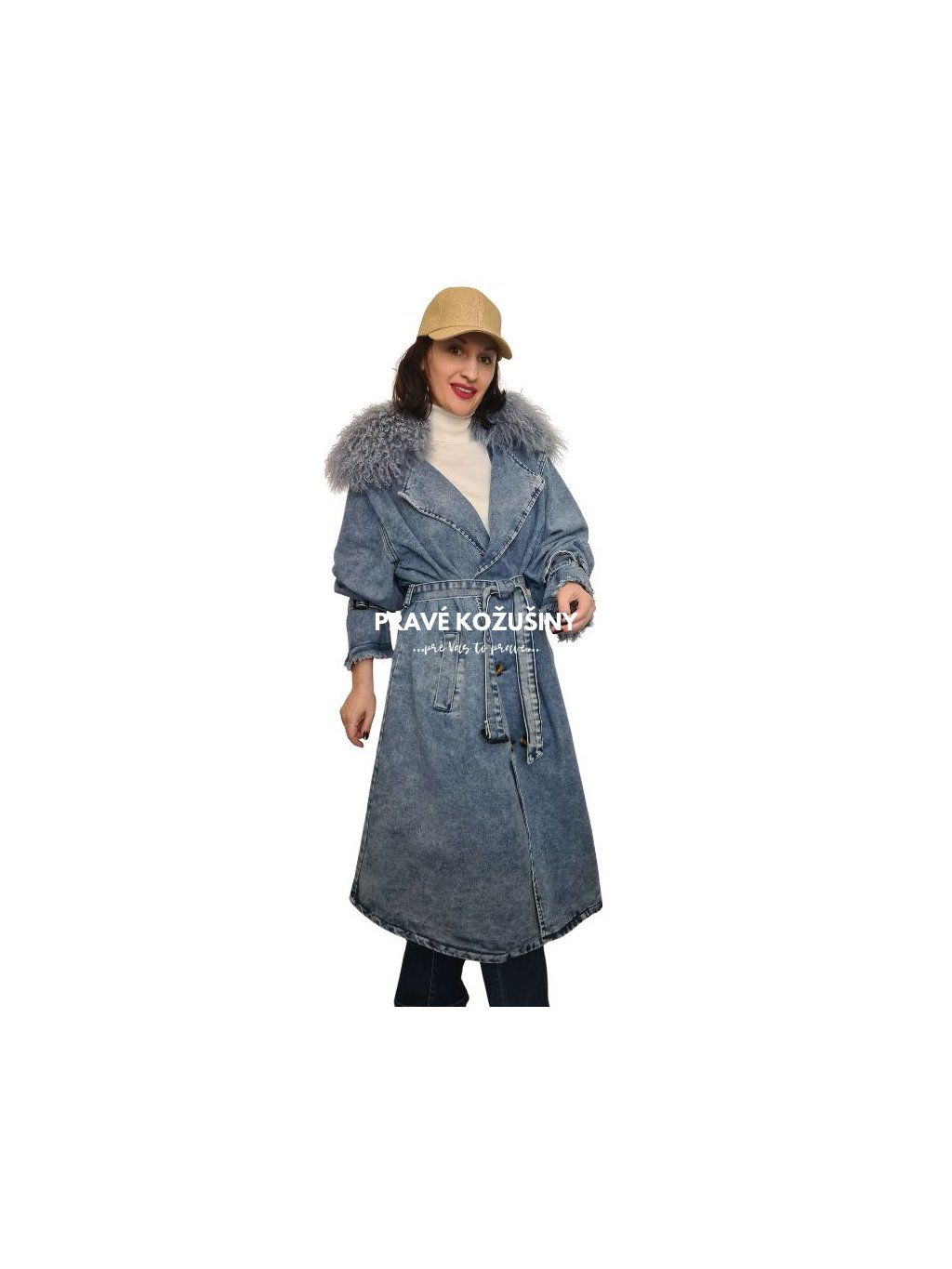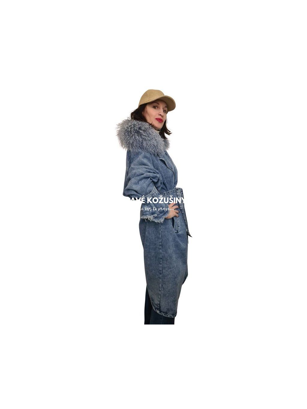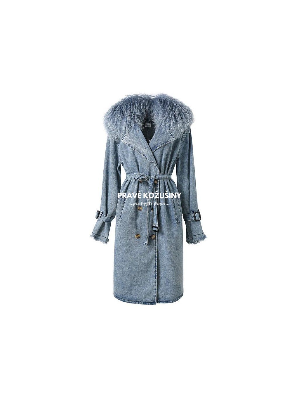 Denimový dámsky kabát s nádherným golierom z pravej mongolskej ovce.