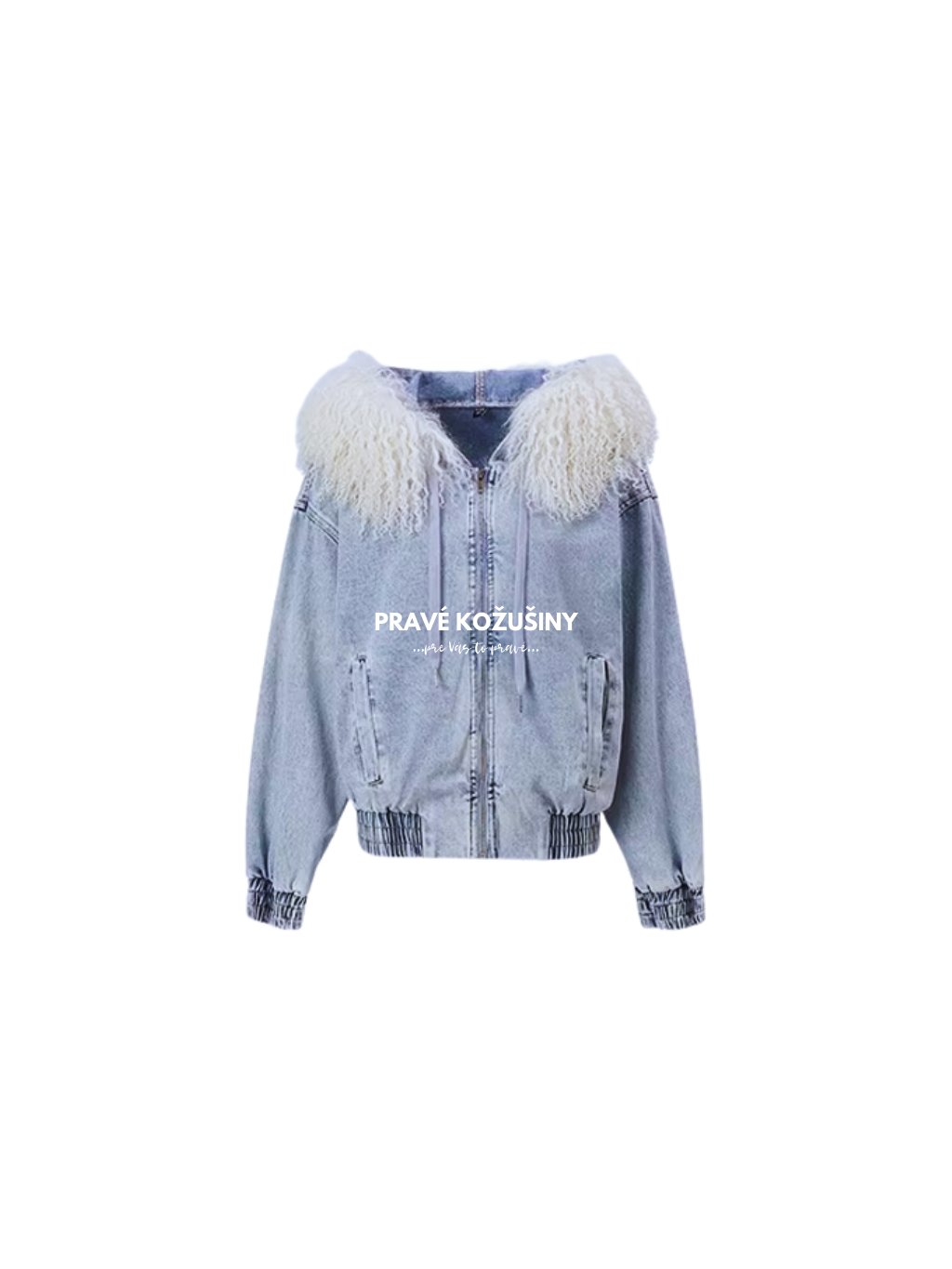 Riflová dámska bombérka s kapucňou s nádherným, bohatýmlemom z pravej mongolskej ovce v svetlej farbe.