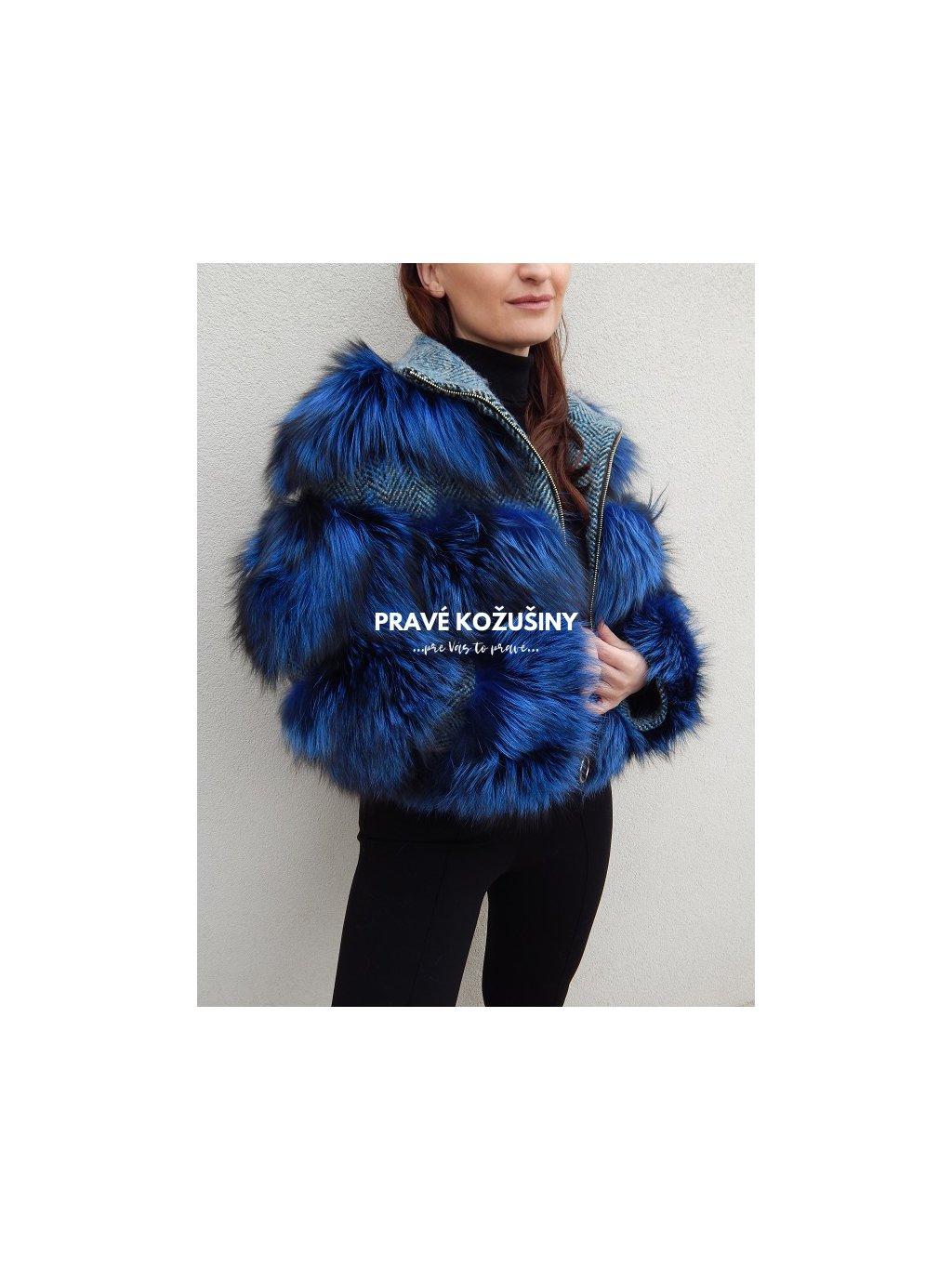 Kožuch je vyhotovený zo 100% vlny v podobe buklé a pásov pravej striebornej líšky farbenej do kráľovsky modrej.