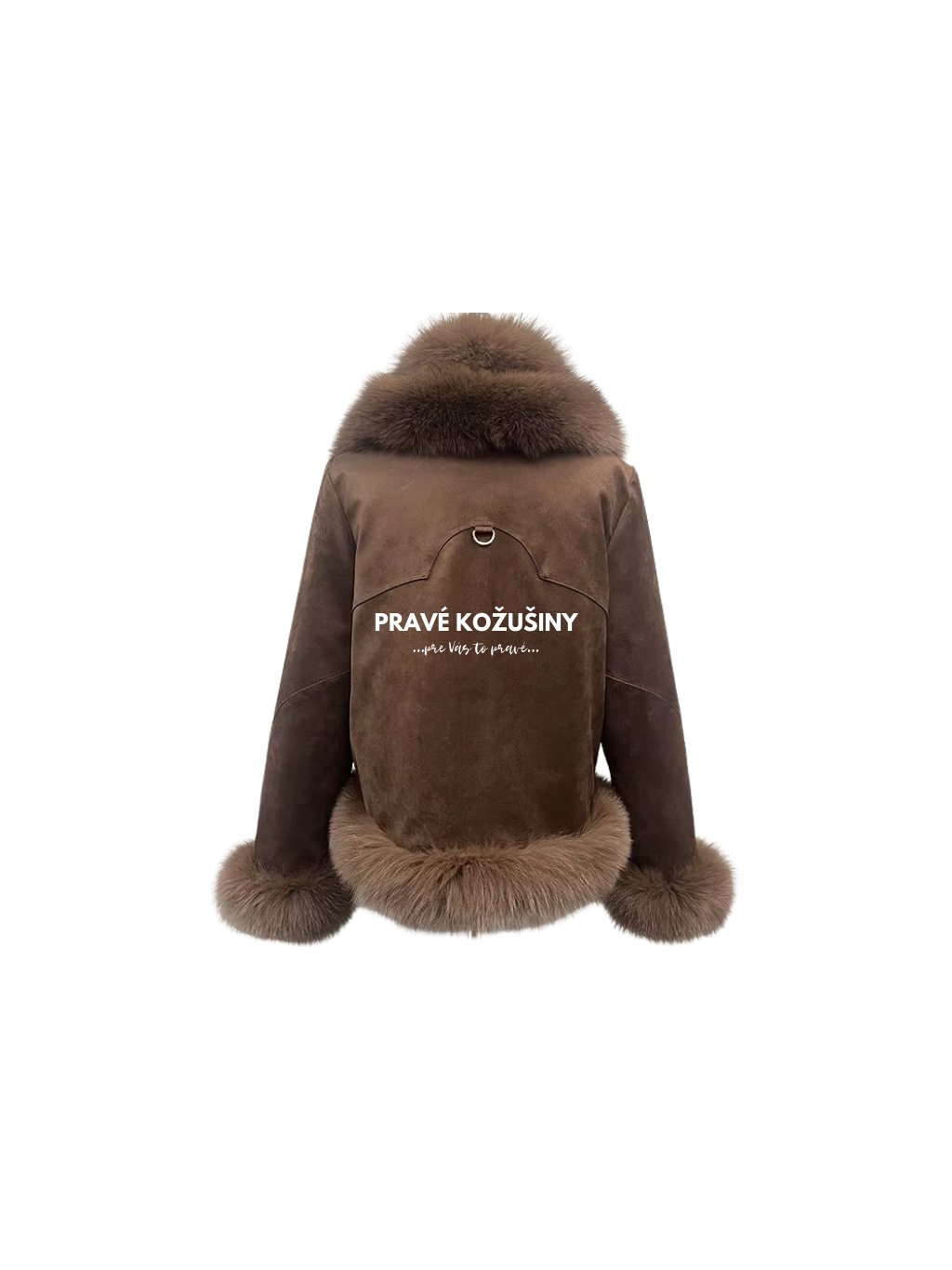 Dámska páperová, kožená, semišová bunda v trendovej čokoládovo hnedej farbe s pravou kožušinou líšky.
