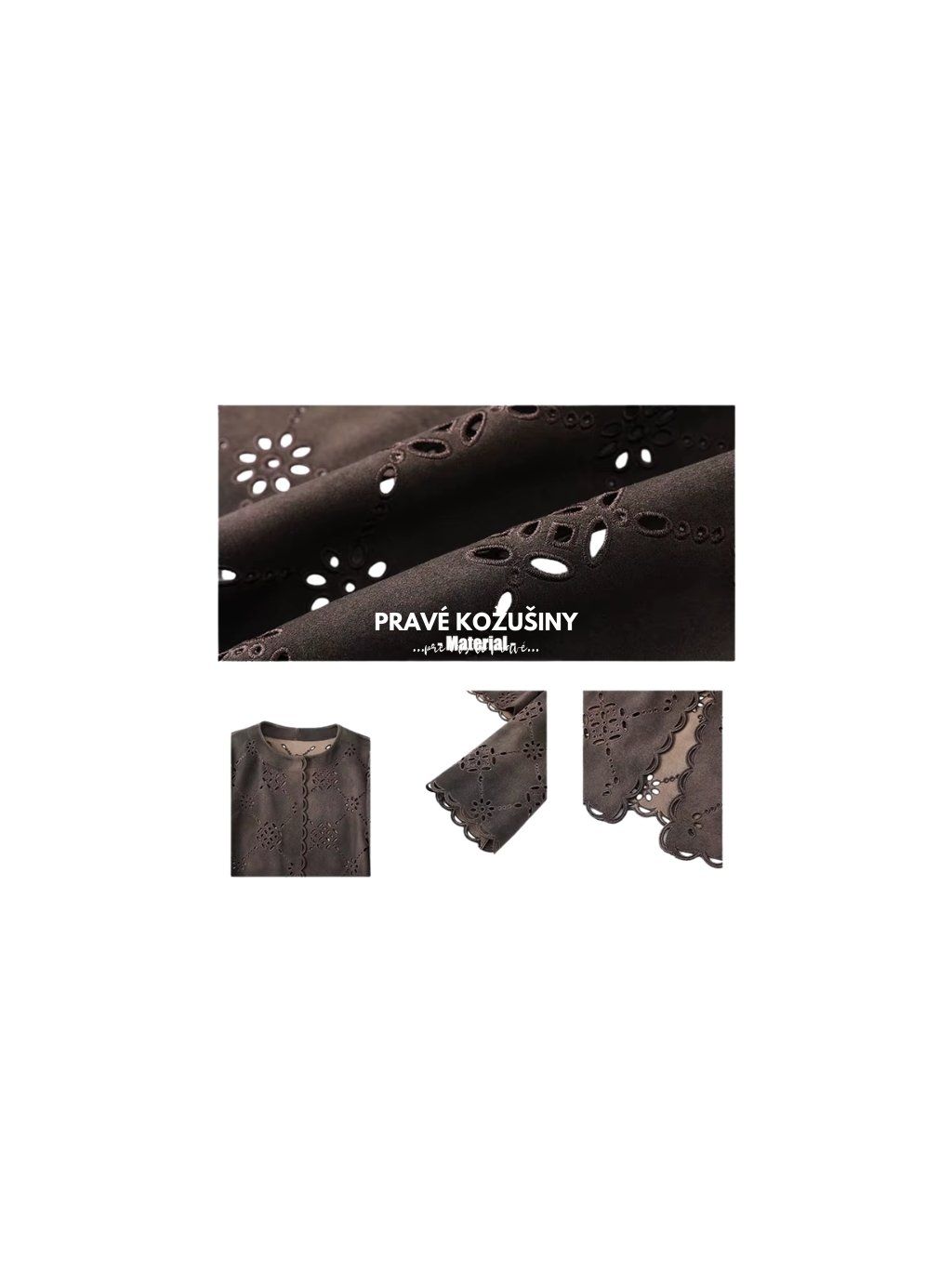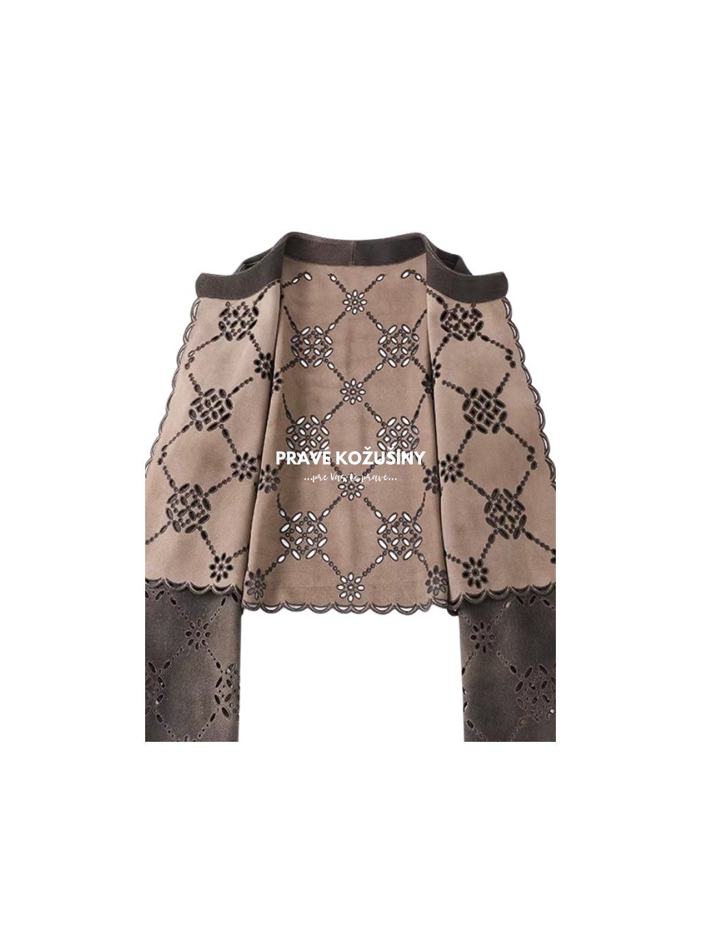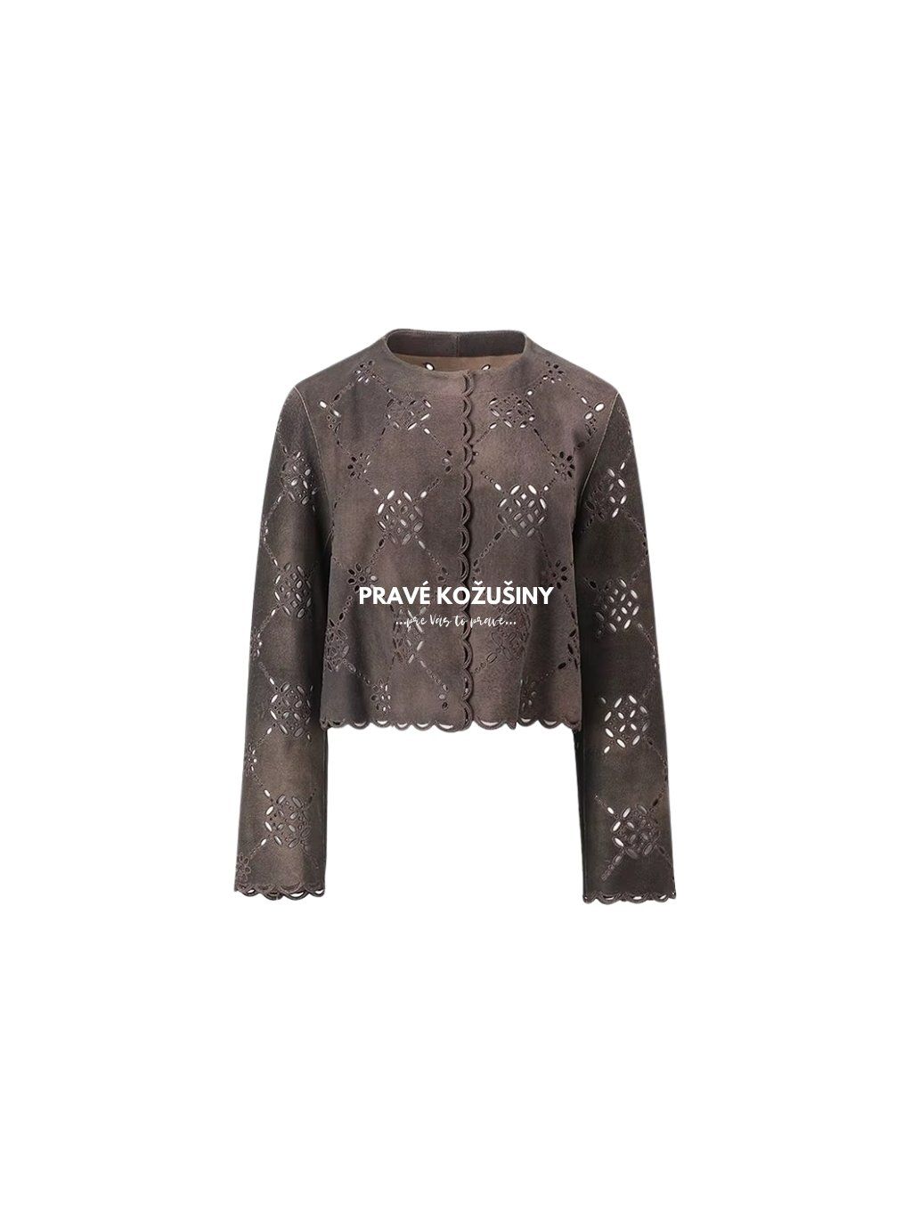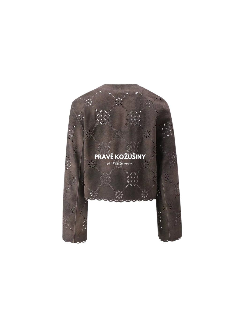 Ľahučká, kávovo hnedá, laserom perforovaná bunda z pravej, mäkkej, jahňacej kože.