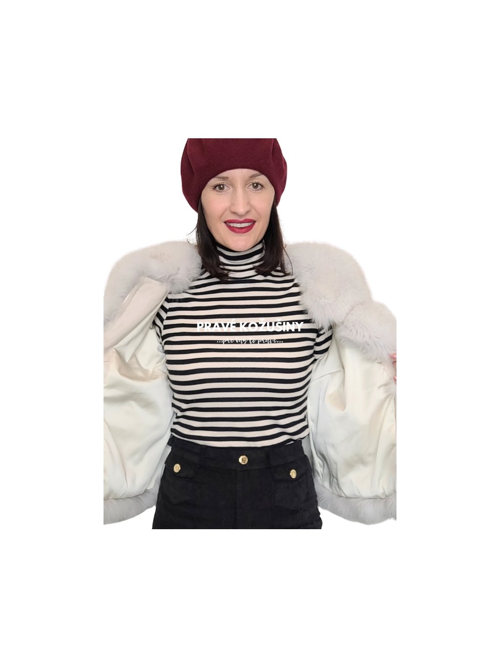 Kožuch je vyhotovený z pravej kožušiny líšky so širšími vodorovnými pruhmi.