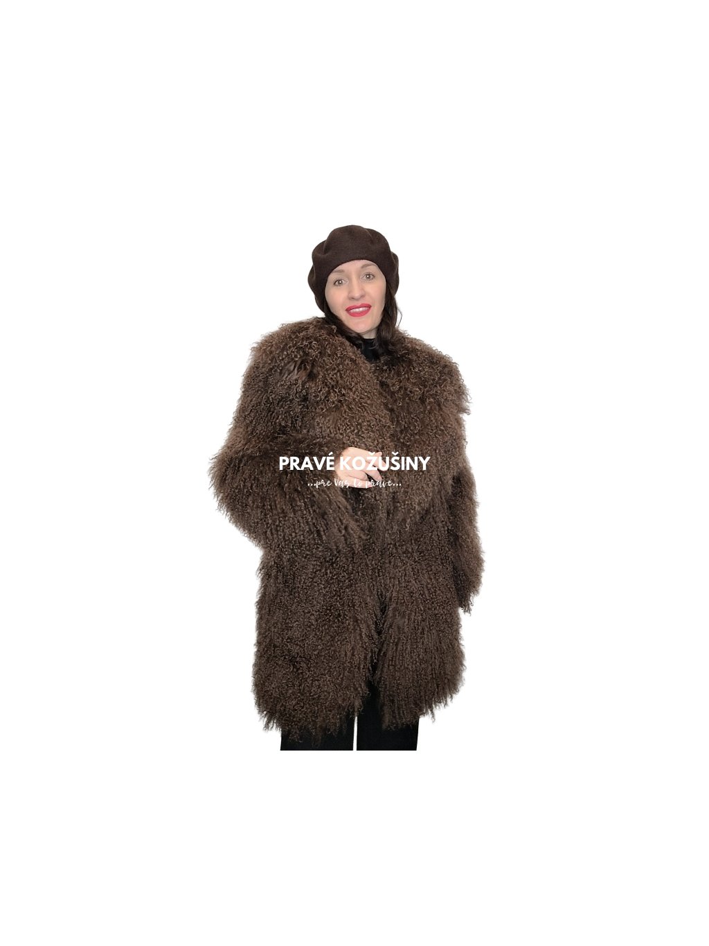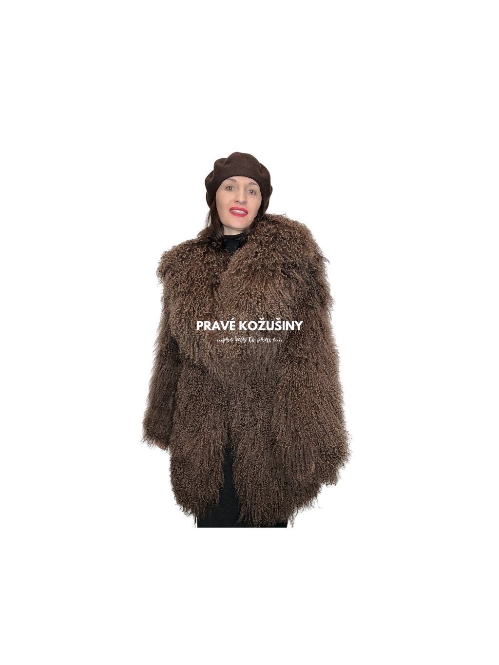 Kávovo hnedý kožuch z mongolskej ovce S VEĽKÝM FAZÓNOVÝM GOLIEROM, K303