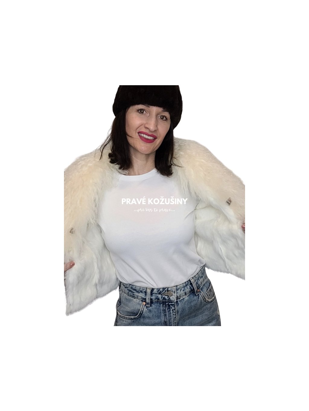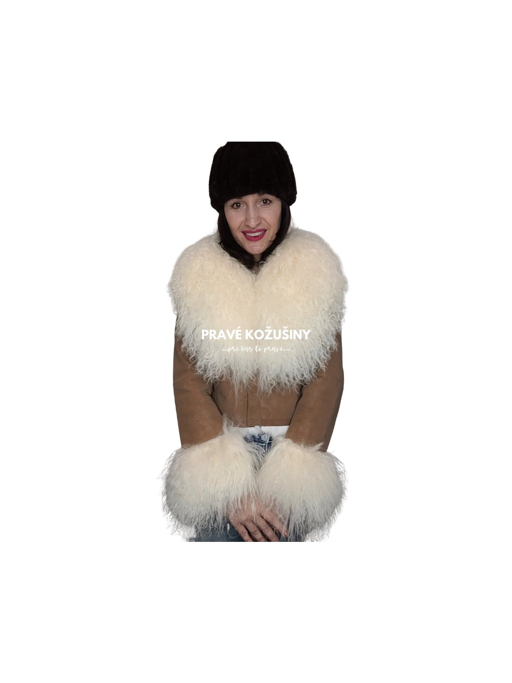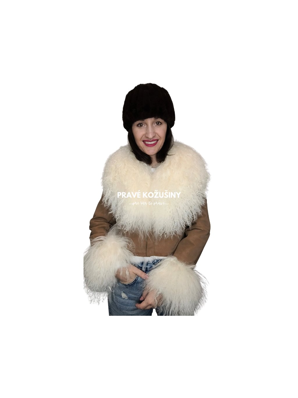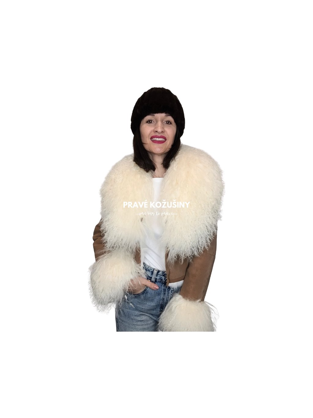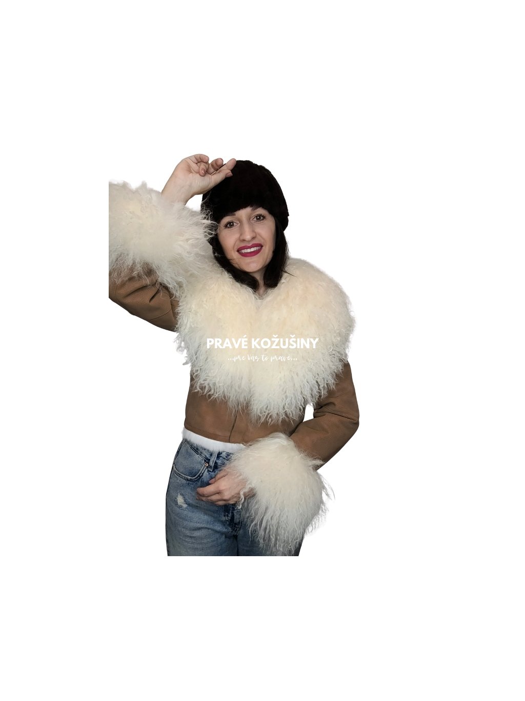 Zateplená pravou kožušinou králika, dámska, semišová (velúrová) bunda s pravou kožušinou mongolskej ovce.