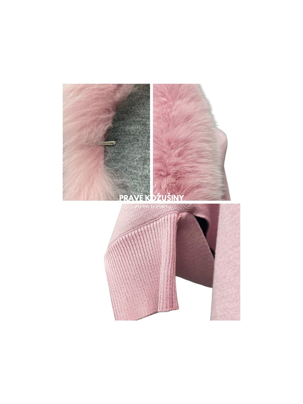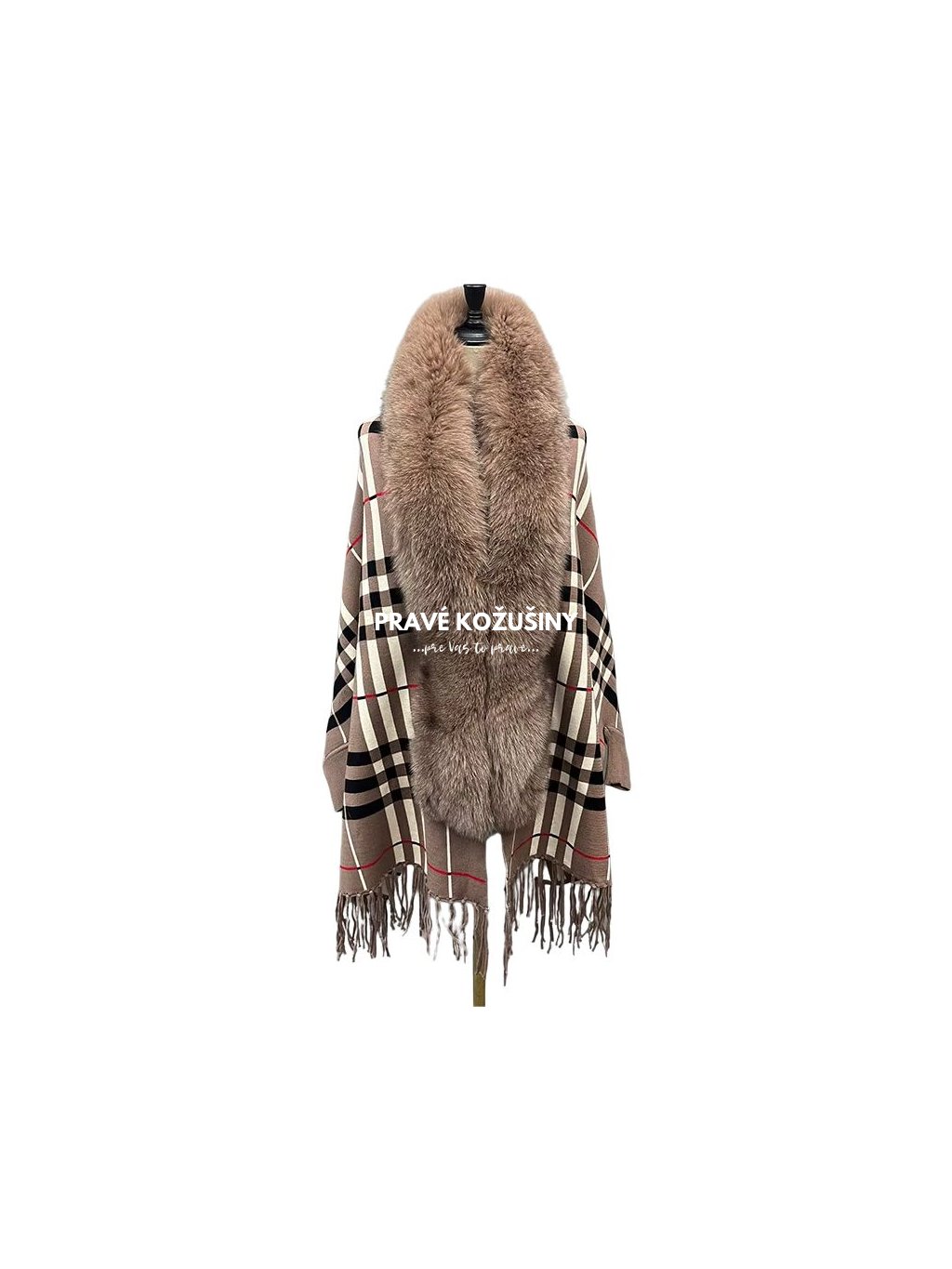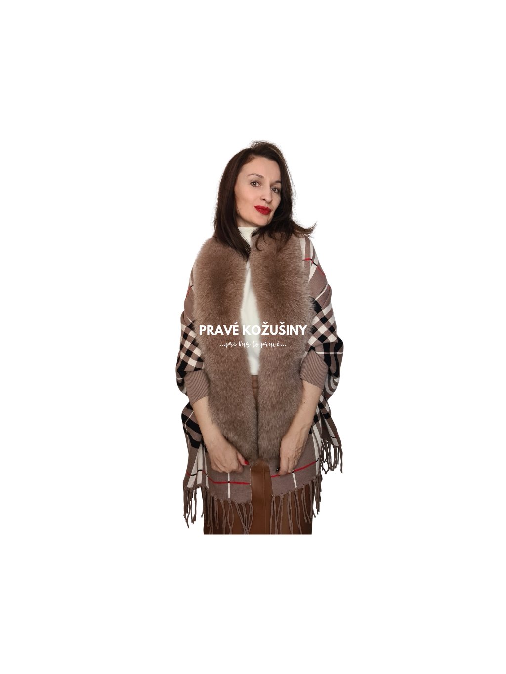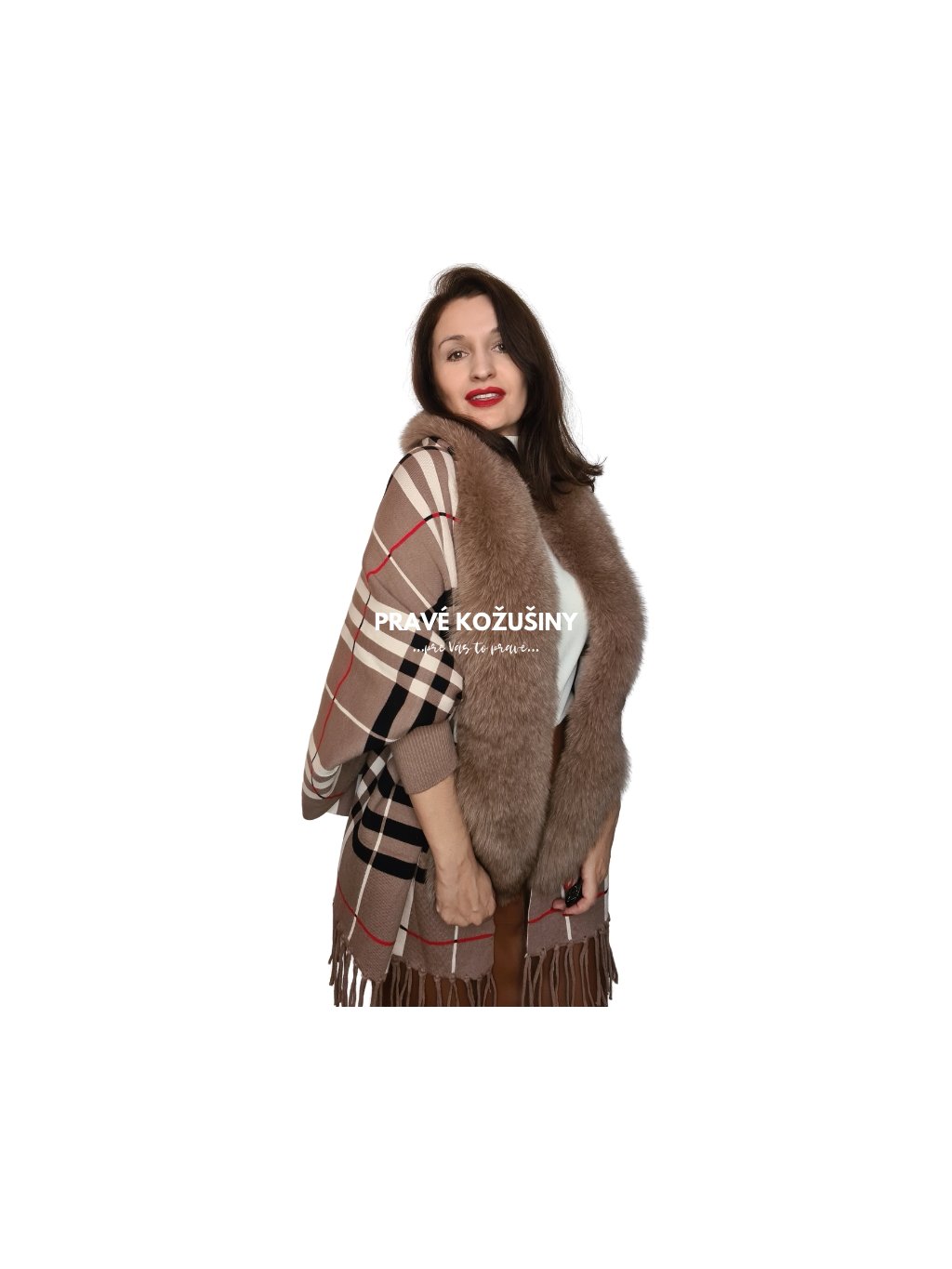 Hnedá károvaná svetrová pelerínka s pravou kožušinou líšky, Pe22B