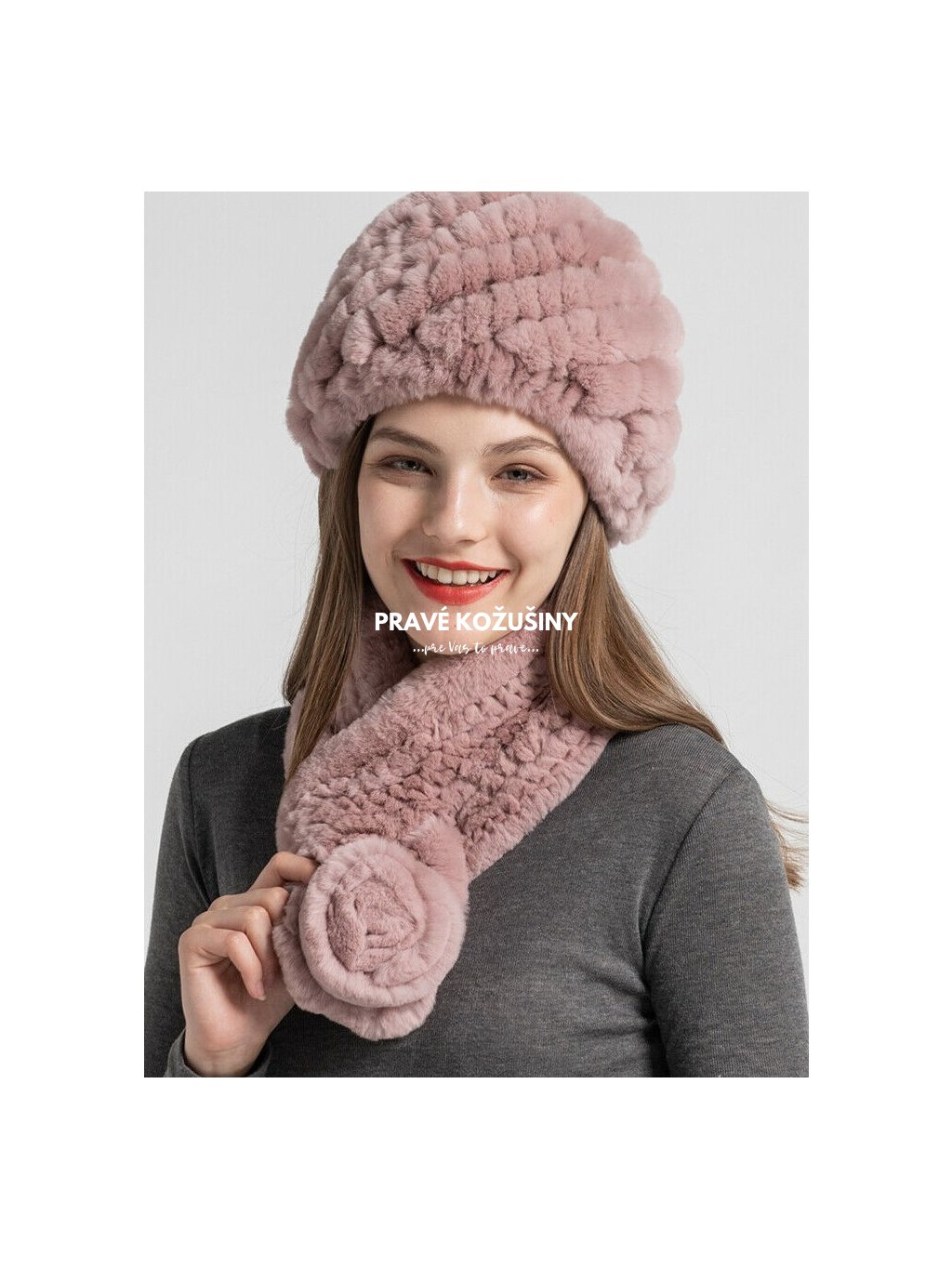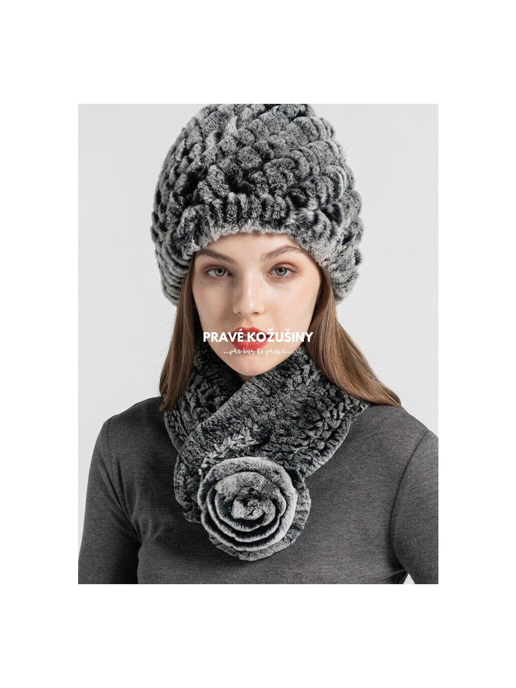 Elegantný set do naozajstnej zimy!Set je vyrobený z pravej kožušiny králika Rex a je mimoriadne príjemný na dotyk.Čiapka je elastická a veľmi teplá. Akrylová, úpletová podšívka.Šál s aplikáciou kvetu z pravej kožušinky králika.