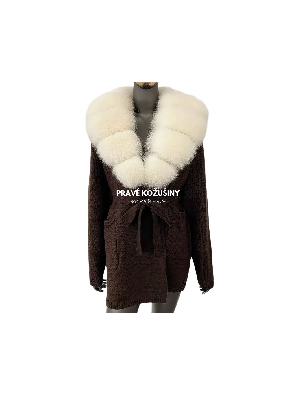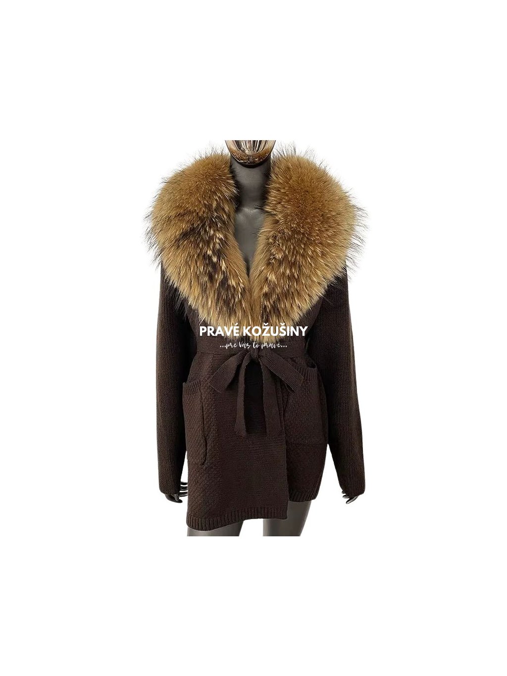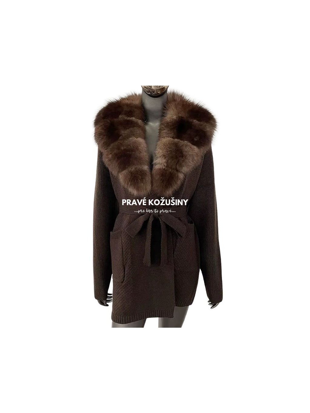 Čokoládovo hnedý kašmírový kardigán s kožušinovým golierom, Sv32