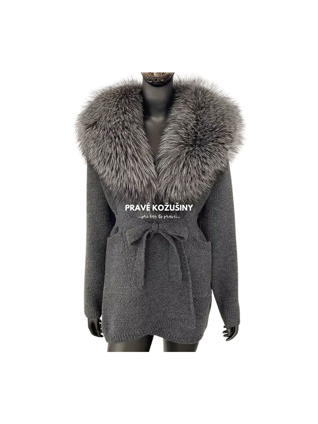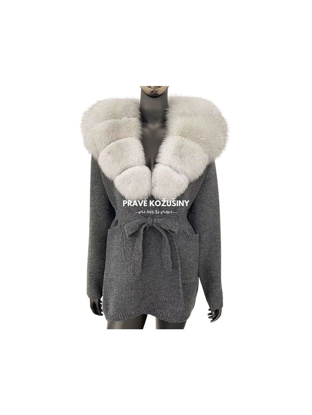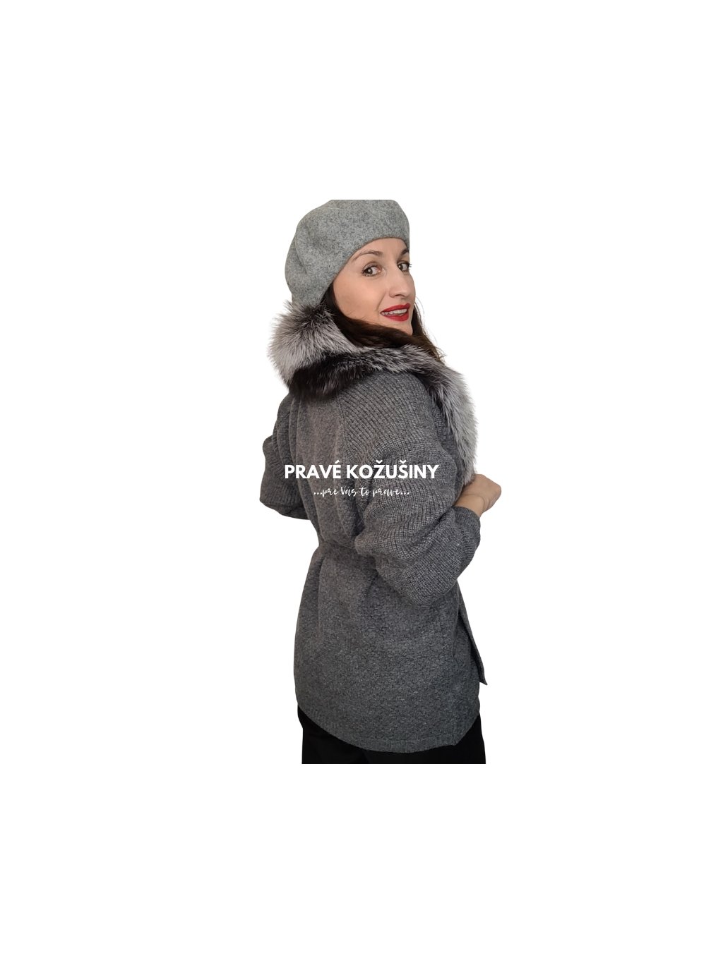 Sivý kašmírový kardigán s kožušinovým golierom, Sv32