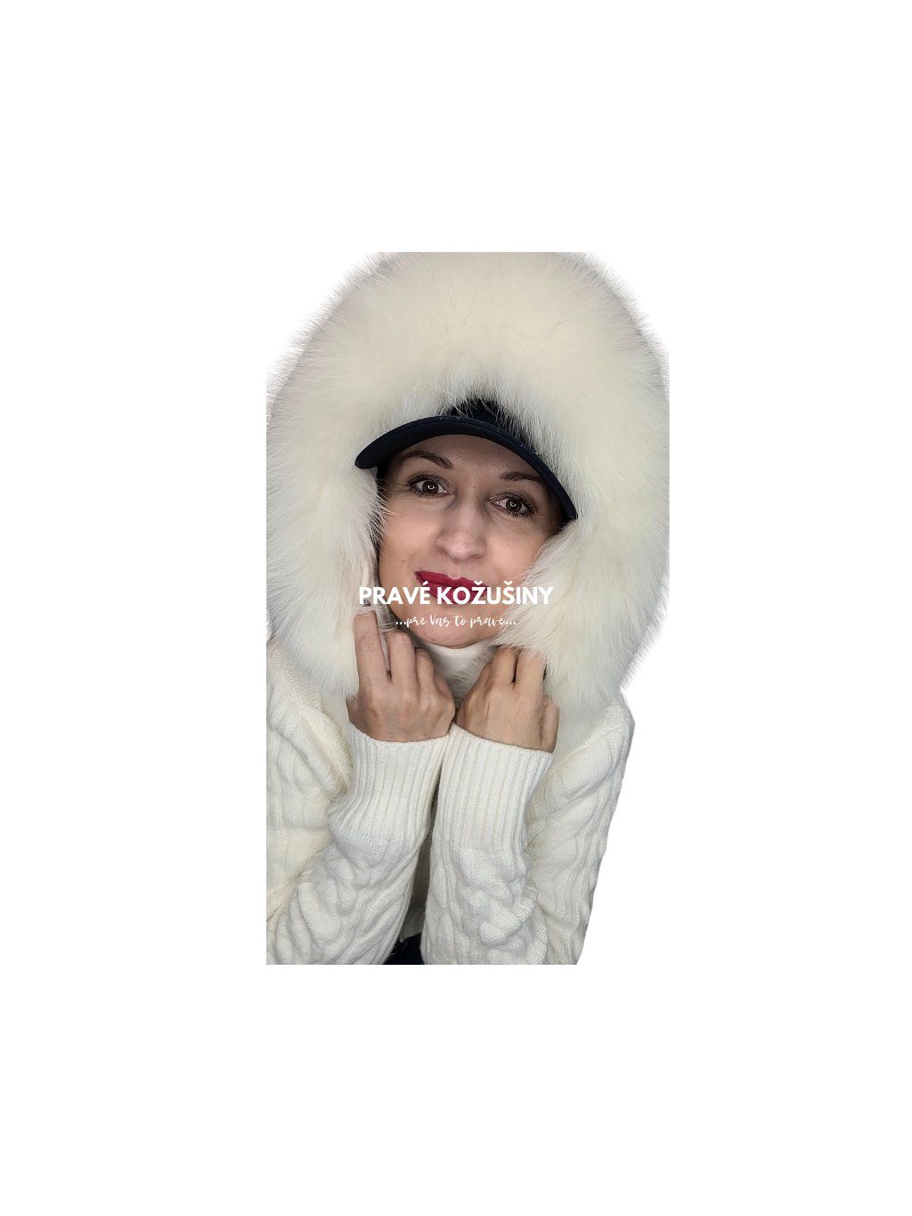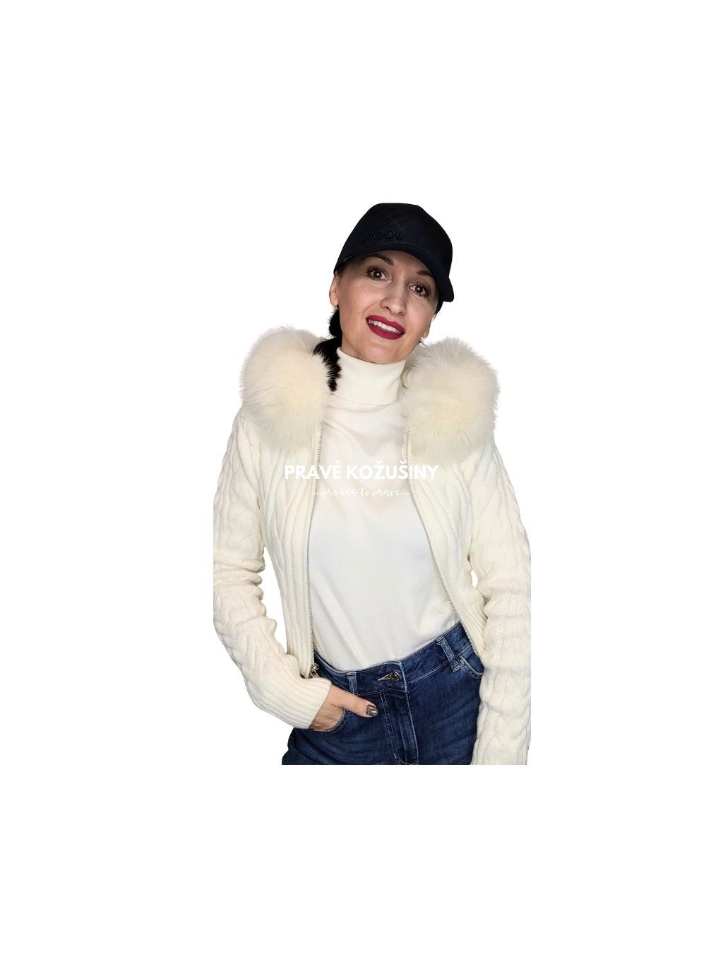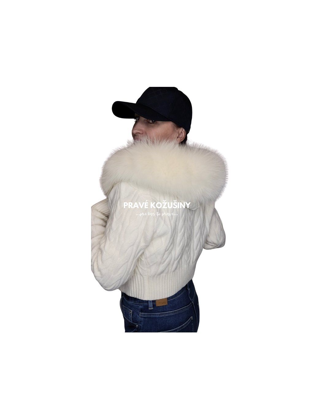 Dámsky úpletový sveter s výrazným osmičkovým vzorom a pravou kožušinkou líšky na kapucni.