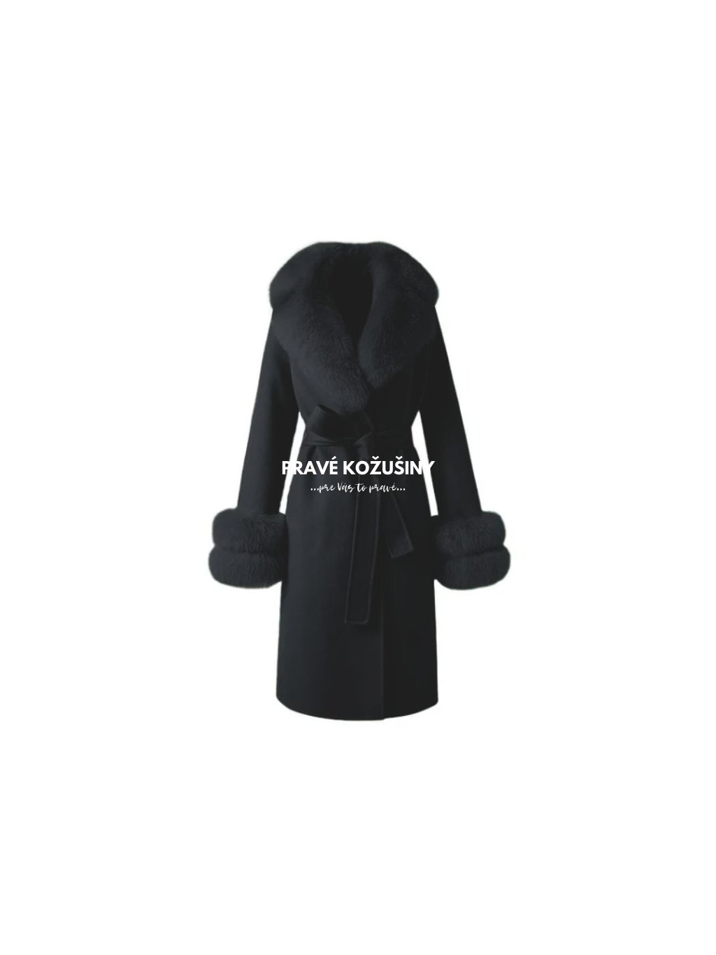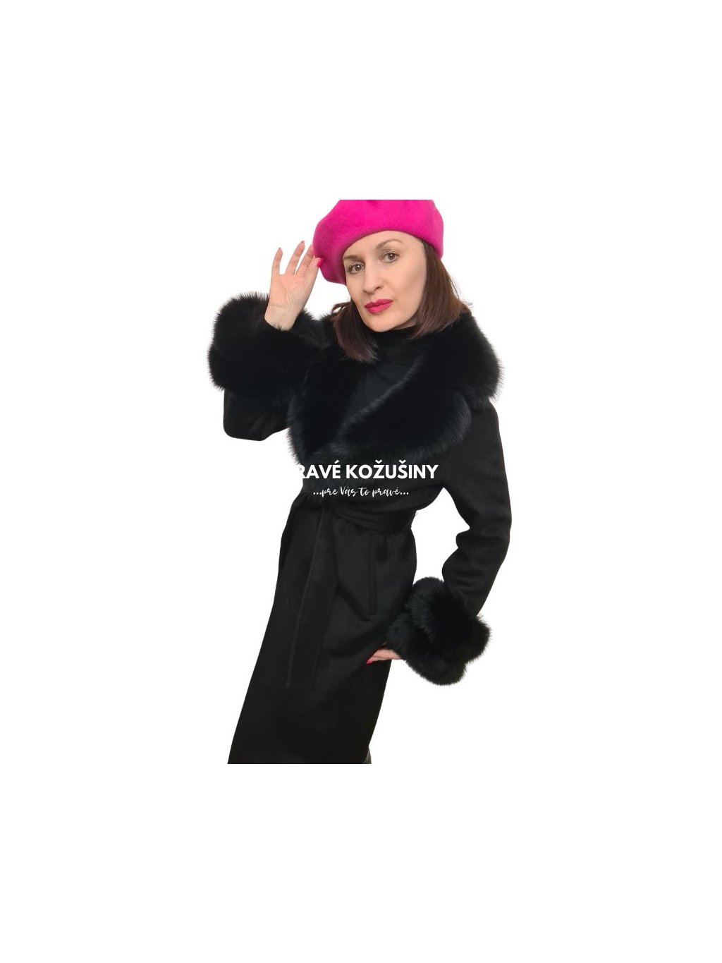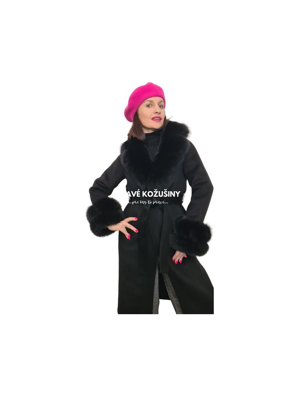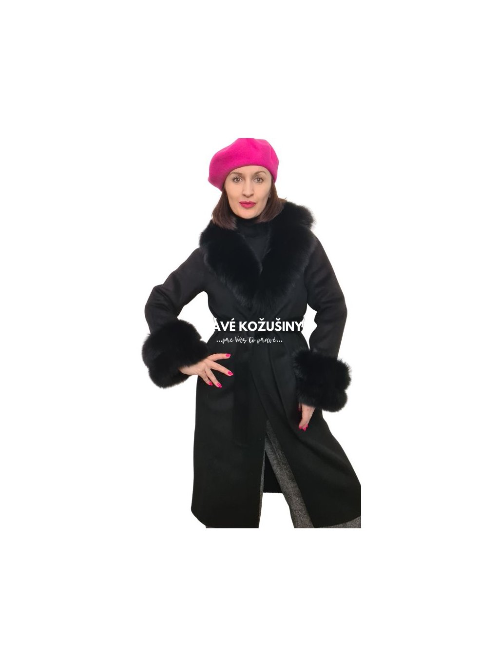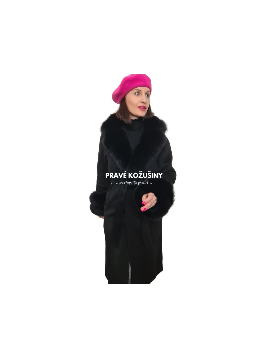 SKLADOM veľ. XL - Čierny dámsky vlnený kabát s pravou kožušinou líšky, K228
